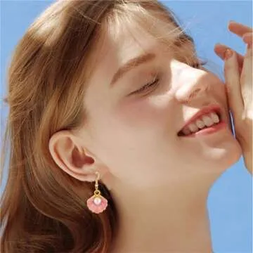 Dreuyet Seashell Pearl Necklace Earrings Set for Women Fashion Enamel Boho Pink Blue Scallop Sea Shell Pendant Necklace Beach Holiday Jewelry Gifts (pink)