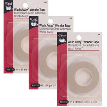 Show more The Dritz 406 1/4-Inch by 10-Yard Wash Away Wonder Tape is the ultimate companion for sewing enthusiasts and crafters alike. This incredible double-sided transparent tape adheres strongly to fabric while allowing you to create that seamless finish you dream of. Measuring 1/4-inch in width and coming in a generous 10-yard roll, the Wonder Tape is perfect for a variety of applications, from hemming delicate fabrics to crafting intricate projects. Its unique formulation allows it to wash away effortlessly, leaving no residue behind, making it a must-have for anyone serious about their sewing and crafting endeavors.