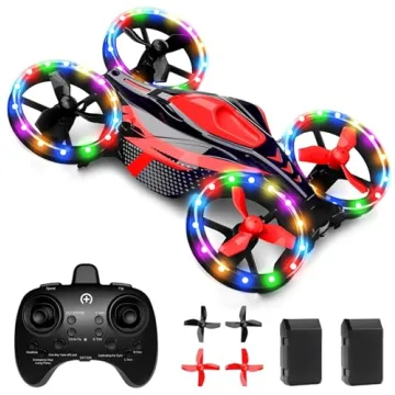 Show more Introducing the ultimate fun and excitement for budding aviators—the mini drone that doubles as a speedy race car! This innovative product features a stunning array of colorful and adjustable LED lights, making it an eye-catching delight for children and adults alike. With 11 vibrant colors and multiple modes, it guarantees captivating visuals whether it’s soaring through the sky or racing across the ground. Imagine your child experiencing the thrill of flying with a toy that transforms from a car to a drone with just a switch!