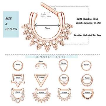 Show moreDiscover the perfect blend of style and comfort with the Drperfect 16G Septum Ring Hinged Clicker Segment Nose Horseshoe Ring. Crafted with precision and elegance, this set of 12 rose gold septum rings offers an exciting array of options to suit any look—from punk chic to classic elegance. The affordable price point makes this jewelry an economical choice for anyone looking to switch up their appearance without breaking the bank. Each piece features a suitable size and smooth end design that prevents discomfort, making it enjoyable to wear throughout the day. Made from high-quality stainless steel, this jewelry is not only durable and resistant to fading but also gentle on the skin, ensuring a comfortable wearing experience.