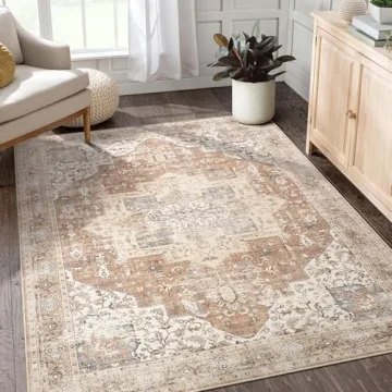 Show more Transform your living space with the DTICON Washable Rug 5x7, a stunning boho vintage rug that seamlessly combines artistry with functionality. Featuring a captivating medallion pattern in rich brick red hues, this area rug is designed to elevate the aesthetic of any home, whether it’s a cozy bedroom, chic living room, or stylish dining area. Crafted with premium low pile fibers, it offers a delightful cloud-like comfort that protects your feet from cold floors, making it perfect for families, pets, and anyone who appreciates a luxurious touch underfoot.