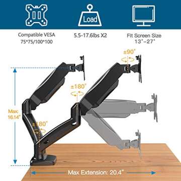 Transform your workspace with the Dual Monitor Mount - an exceptional adjustable gas spring dual monitor desk stand designed for optimal performance and ergonomics. This stand supports two monitors ranging from 13 to 27 inches, making it compatible with a wide variety of displays on the market, thanks to its VESA 75x75mm or 100x100mm mounting capabilities. Each arm can hold up to 17.6lbs, providing a sturdy yet flexible solution for creating...