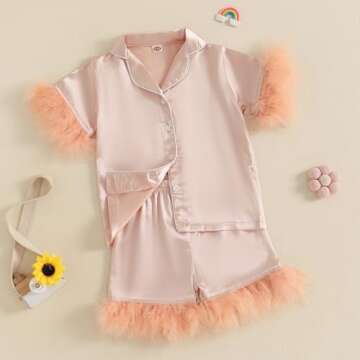 DuAnyozu Satin Pajama Set Toddler Girl Pjs Kids Feather Trim Short Sleeve Shirt Elastic Waist Shorts Little Girls Clothes (Light Orange, 8-9 Years)