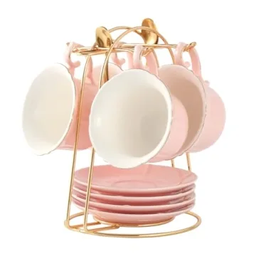 Indulge in the exquisite beauty of the DUJUST Candy Color Cup Saucer Set in Golden Trim, a stunning collection that promises to transform your tea or coffee rituals into a lavish affair. This remarkable set includes four elegantly designed cups (8 oz/235ml), four coordinating saucers (5.3 inches), and four charming spoons, all beautifully arranged on a chic golden stand. The petal-shaped design is not just visually appealing but also imbues your gatherings with a touch of classic sophistication...