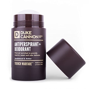 Show more Introducing the Duke Cannon Supply Co. Trench Warfare Antiperspirant & Deodorant, a premium solution tailored for the modern man who demands performance and sophistication. This 2.75 oz stick is formulated to combat sweat and odor, effectively utilizing the power of activated charcoal to keep your underarms fresh and clean. With a classic masculine scent that blends sandalwood and amber, this deodorant not only protects but also enhances your personal aura, ensuring you smell great throughout your day. Perfectly sized for travel, you can confidently carry it wherever the adventure takes you.