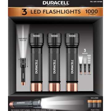 This set comes complete with 12 AAA batteries—four for each flashlight—so you’re ready to shine bright right out of the box. The Duracell flashlights boast a remarkable 1000 lumens, providing a bright and clear light that can illuminate even the darkest environments. The product includes versatile lighting options such as low and strobe modes, catering to various situations and ensuring you're always prepared.