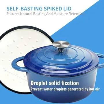 Show moreExperience the perfect blend of form and function with the Dutch Oven Cast Iron 5 Quart Enameled Cast Iron Dutch Oven Pot. This stunning pot features a self-circulating lid designed to capture steam and redistribute moisture back onto your food, ensuring every meal retains its original flavors and nutrients. The vibrant blue color, complemented by graduated teal tones, adds a beautiful touch to your kitchen while preventing stains and chipping. Cook, serve, and impress your family and friends with this essential kitchen companion that excels in making everything from hearty stews to delicate sourdough!