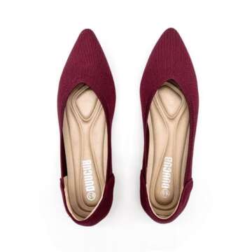Show moreIntroducing the DUUCUB Women's Pointed Toe Slip On Ballet Flats Dress Shoes, exquisitely crafted for the modern woman who seeks both style and comfort. Designed with a breathable mesh knit upper, these flats effortlessly combine elegance with everyday usability. The delightful burgundy hue adds a touch of sophistication to any outfit, making these shoes perfect for both casual errands and dressy occasions. Slip-on design ensures a hassle-free experience, enabling you to step into style with ease, whether you’re rushing out the door or gearing up for an evening event.