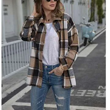 Duyang Women's Casual Wool Blend Plaid Shirt Jacket Retro Long Sleeve Button Down Shakcet Coat(Brown,XL)