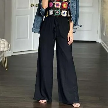 Duyang Womens Cotton Linen Palazzo Pants Drawstring Elastic Waist Casual Wide Leg Trousers with Pockets(Black,XL)