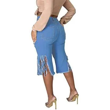 DvaeMalligo Blue Denim Jean Shorts Womens High Waisted Ripped Stretchy Destroyed Distressed Raw Hem Tassels Bermuda Shorts(Blue,XL)