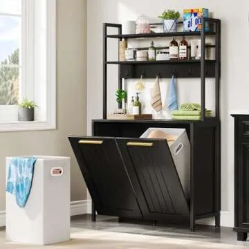 DWVO Laundry Hamper with Shelves, 3-Tier Laundry Hamper Cabinet 53" Tilt Out Hamper with 6 Hooks and 2 Removable Laundry Baskets for Laundry Room Bathroom, Black