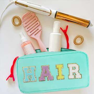 DYSHAYEN Nylon Cosmetic Bag Preppy Hair Makeup Bag for Women Travel Toiletry Organizer with Chenille Letter Patches (Mint-HAIR)