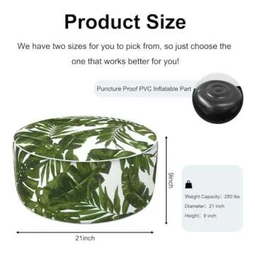 Show moreElevate your relaxation experience with the DYTXIII Inflatable Ottoman Stool! This versatile footrest is perfect for both indoor and outdoor use, making it an essential addition to your home, garden, or camping kit. Crafted with a durable PVC explosion-proof liner, this inflatable ottoman is designed to withstand wear and tear while comfortably supporting up to 300 pounds. Its palm green cover adds a touch of style to your patio or deck while also being water-repellent and UV-resistant, ensuring long-lasting use.