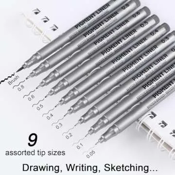 Show moreIntroducing the Dyvicl Micro-Pen Fineliner Pens, a premium collection designed for artists and creators alike. This 9-pack features a range of assorted nib sizes including 0.2 mm (005), 0.25 mm (01), up to 1 mm soft brush tip, allowing you to explore infinite creative possibilities. Whether you’re sketching, illustrating, doodling, or journaling, each pen provides the precision and versatility you need to let your imagination run wild. With a water-resistant black pigment ink, you can confidently produce bold lettering and intricate details without worrying about smudging or fading, making these pens essential for both casual creators and professional artists.