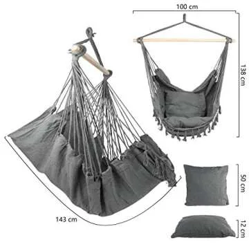 Show more Transform your relaxation experience with the E EVERKING Hammock Chair, a perfect fusion of comfort and style designed for both indoor and outdoor use. Crafted from premium, heavy-duty cotton canvas, this hammock chair accommodates up to 265 lbs (120 kg), making it an ideal seating solution for anyone looking to unwind. With its 39-inch sturdy wooden spreader bar, it opens up effortlessly for easy access, whether you're settling in with a great book or enjoying the view from your patio. The addition of two extra-large cushions (16x16 inches) ensures a plush seating experience that cradles your body comfortably, allowing you to lounge for hours in bliss.