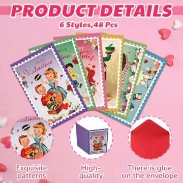 Show more Step into nostalgia with the Eaasty 48 Sets Mini Vintage Valentines Day Cards. Each set celebrates the sweet essence of Valentine's Day through beautifully designed cards that evoke fond memories of childhood exchanges in elementary school. With a total of 48 unique pieces crafted into 6 charming designs, and accompanied by equally exquisite red envelopes, these cards are perfect for sharing feelings of love and affection. Measuring 4.33 x 5.35 inches when unfolded and perfectly complemented by 4.88 x 3.23 inch envelopes, they offer both style and practicality for heartfelt expressions this Valentine’s.