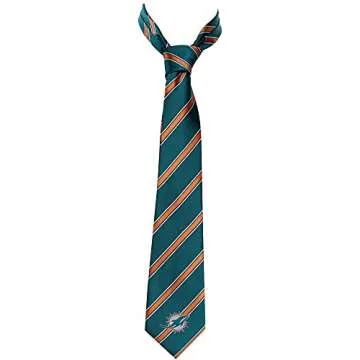 Show moreElevate your game day style with the Eagles Wings Men's Miami Dolphins Woven Poly Striped Tie. This stunning tie seamlessly blends functionality and team pride, ensuring you look your sharpest while supporting your favorite NFL team. Crafted from high-quality woven materials, this tie not only showcases the Miami Dolphins' iconic colors but also features the newly revamped logo that captures the rich history and essence of the team. Measuring approximately 57 inches long, it's designed to provide a comfortable fit for all body types, making it the perfect accessory for any football enthusiast.