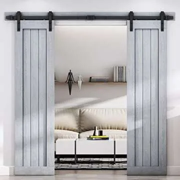 Show more Transform your living space with the EaseLife 8 FT Double Door Sliding Barn Door Hardware Track Kit. Crafted from solid steel and finished with a fine black powder coating, this heavy-duty kit guarantees not only a stunning aesthetic but also durability that lasts for years. Designed to accommodate double doors up to 24 inches wide, this kit boasts a remarkable weight capacity of 250 pounds, ensuring it can handle even the heaviest of doors while providing a smooth and quiet sliding motion, tested for over 100,000 rolls. Each component of the kit has undergone multiple inspections to meet high-quality standards, ensuring you receive a product you'll love.