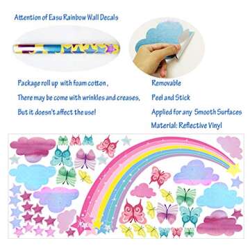 Show moreTransform any space into a vibrant wonderland with the Easu Rainbow Wall Decal featuring enchanting butterflies and fluffy cloud designs. Measuring 15.75” x 35.4”, these wall stickers are crafted with high-quality, environment-friendly ink and materials, ensuring that they are safe for your home and the planet. Easy to apply—just peel and stick—these decals can revamp your child’s bedroom, playroom, or any area that deserves a splash of color. They adhere seamlessly to a variety of smooth and clean surfaces such as walls, glass, and even notebooks, allowing you to personalize everything from laptops to water bottles.