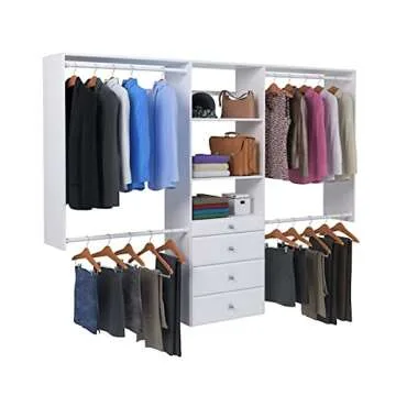 Show more Introducing the ultimate solution for all your storage woes: the Closet Storage Tower System. This versatile and stylish storage unit is designed to elegantly hang on a sturdy steel track, mounting conveniently to your wall to maximize space and efficiency. With four spacious drawers, six adjustable shelves, and four robust rods, this system makes organizing your clothing, shoes, and personal items not just easy, but enjoyable. Say goodbye to clutter and hello to a beautifully organized closet!
