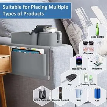 Show more Introducing the ultimate solution for couch lovers and home entertainment enthusiasts – the upgraded couch arm tray! This exceptional product is designed to provide a seamless and enjoyable lounging experience, making it an essential accessory for anyone looking to elevate their sofa setup. Made from high-quality silicone material, the tray ensures superior durability and a snug fit for armrests wider than 6.2 inches. Say goodbye to the chaos of scattered remotes and drinks as this innovative design features a clever card slot for convenient phone charging, along with two spacious storage pockets for easy organization.