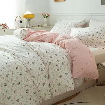 EAVD Vintage Style Garden Pink Floral Duvet Cover Queen 100% Cotton White Pink Floral Bedding Set for Girls Women Chic Shabby Boho Botanical Floral Comforter Cover with Zipper Closure 4 Ties