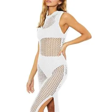 Ebifin Womens Sexy Cover Ups Crochet Dress Sleeveless Crew Neck Hollow Out Beach Cover Up Side Slit Knit Midi Dresses White