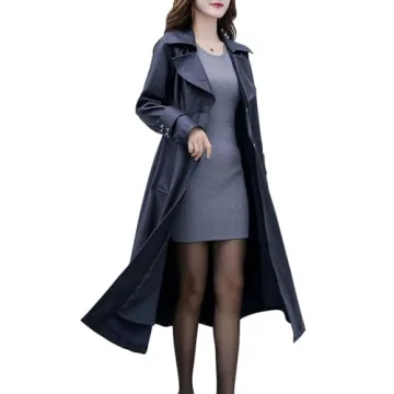 ebossy Women's Elegant Lapel Collar 2 Button Fit-Flare Pu Leather Long Trench Coat