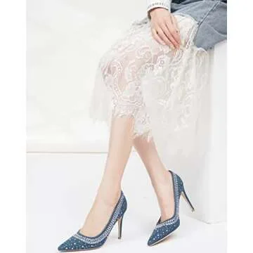 EBYNUE Women's Pumps Sexy Rhinestone High Heels 4 inch Pointed Closed Toe Stiletto Heel Evening Party Wedding Comfortable Dress Shoes Blue Denim