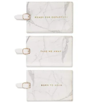 Show moreEccolo's boxed set of 3 luggage tags is the perfect blend of style and functionality, designed to make your travel suitcase or baggage easily identifiable. Each tag in this exquisite set features a unique marble design, complemented by gold embossed words that resonate with every traveler's spirit: 'Ready For Departure', 'Take me Away', and 'Born To Roam'. Crafted from high-quality faux leather, these tags boast thin stitching and a PU leather strap with a belt buckle closure, ensuring durability and a touch of elegance. Measuring 2.5 x 4.5 inches, their eye-catching designs not only add a personal touch to your luggage but also make them easy to spot on the baggage carousel. Packaged in a gift-ready box, this set is an ideal present for any occasion, from bridal showers to birthdays, especially for those with a passion for adventure.