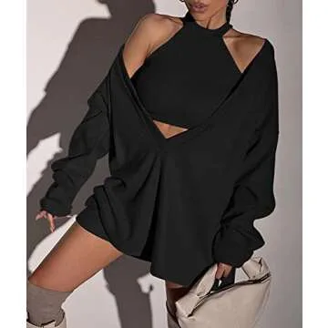 ECDAHICC Women's Two Piece Outfits Knitted Halter Neck Crop Tank Tops and Oversized Off Shoulder Deep V Neck Pullover Sweater