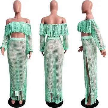 Show more Introducing the ECHOINE Women Two Piece Skirt Set, a stunning blend of style and comfort designed to elevate your beachwear game. Made with a luxurious combination of Polyester and Spandex, this soft and comfortable fabric ensures you will look fabulous while feeling at ease all day long. The unique tassel hollow out design not only adds a touch of elegance but also enhances your silhouette with every movement. Featuring an on-trend off-shoulder neckline and a daring high split, this outfit perfectly showcases your shape whether you're dancing the night away or lounging by the sea. Available in a striking blue color and a range of sizes up to 3XL, this set is made to fit and flatter a variety of body types.