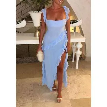 Show moreStep into the spotlight with the Ecirod Womens Spaghetti Strap High Slit Bodycon Maxi Dress, designed for those who embrace elegance and style. This stunning blue dress is made from a perfect blend of high-quality Polyester and Spandex, ensuring a soft and stretchy fit that not only flatters but also keeps you comfortable all day long. The standout feature, a high slit ruffle design, adds a daring edge while allowing freedom of movement, making it your go-to choice for a plethora of occasions.