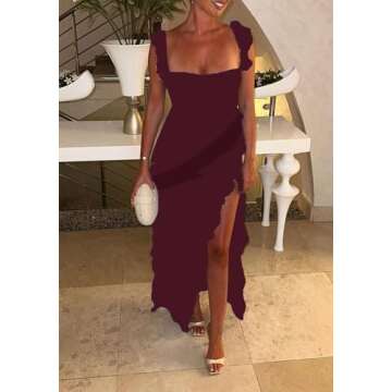 Ecirod Womens Square Neck Slip Maxi Dress Summer Sundress Ruffle Stitching Sleeveless Dresses with Slit Wine