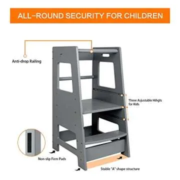 ECOMEX Standing Tower for Toddlers, Toddler Stool for Kitchen Counter Kids Kitchen Step Stool with Safety Rail Toddler Standing Tower with Adjustable Platform for Kitchen Counter, Upgraded Grey