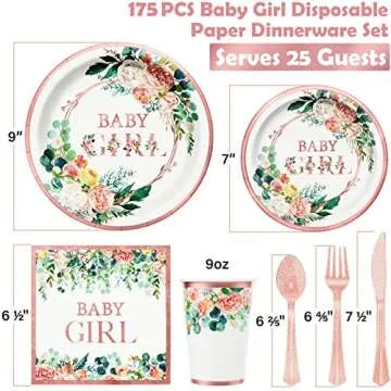 Show more Transform your next celebration with our exquisite Baby Girl Party Supplies Dinnerware Set, which includes an impressive 175 pieces of beautifully designed tableware. This set comes complete with 25 x 9inch disposable dinner plates, 25 x 7inch dessert plates, 25 x 9oz paper cups, 25 x 6.5inch baby girl paper napkins, and 75 pieces of golden plastic cutlery including forks, knives, and spoons. Designed with love, these durable rose gold floral decorations not only serve 25 guests at once but also create a magical ambiance for your event.