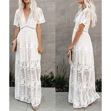 Ecosunny Women's Deep V Neck Short Sleeve Floral Lace Bridesmaid Maxi Dress Party Gown