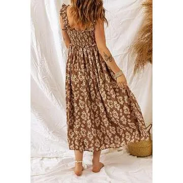 Ecosunny Women's Summer Casual Loose Dress Brown Ruffled Straps Smocked Floral Maxi Dress Brown S