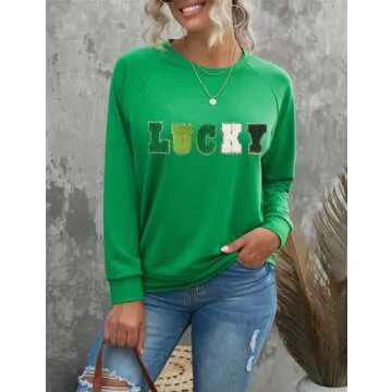 Ecosunny Women's White Sequin St Patrick Clover Patch Sweatshirt Holiday Graphic Shirt Crewneck Long Sleeve Pullover Tops