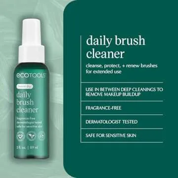 Show more If you're looking for a hassle-free way to keep your makeup brushes in pristine condition, the EcoTools Daily Brush Cleaner is your ultimate solution. This quick-dry brush spray is specially formulated to tackle not only stubborn but also waterproof makeup, ensuring your brushes remain spotless with minimal effort. The eco-friendly brand EcoTools is committed to quality and sustainability, making this product a must-have for both casual makeup users and professional artists alike.