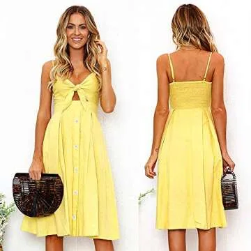 Show moreIntroducing the ECOWISH Women 2024 Summer Dress, a stunning addition to your wardrobe, perfect for any occasion. This beautiful yellow midi dress features a graceful tie front design that embraces the elegance of summer fashion. Made of soft, lightweight polyester, this dress promises to keep you comfortable while still making you look incredibly chic. With its stylish V-neck and open back, this A-line dress brings a touch of sophistication to your ensemble, ensuring you turn heads wherever you go.