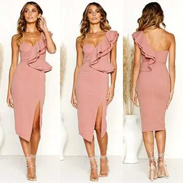 Show moreStep into elegance with the ECOWISH Women's Dresses Sexy Ruffle One Shoulder Sleeveless Split Bodycon Midi Party Dress. Crafted from a luxurious blend of polyester and spandex, this exquisite dress is designed for ultimate comfort with a soft touch that feels pleasant against your skin. The stretchable fabric allows for the perfect fit, enabling you to move gracefully while looking stunning. Featuring a trendy one-shoulder design, intricate ruffle details, and a chic split style that accentuates your figure, this knee-length bodycon dress is sure to make you shine at any event.