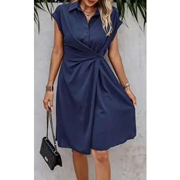ECOWISH Womens Casual Summer Dresses 2025 Solid V-Neck Short Sleeve Button Down Shirt Midi Dress for Women Navy Blue L
