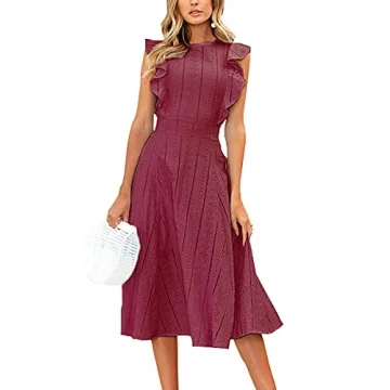 Show moreIntroducing the ECOWISH Women's Dresses Elegant Wedding Cocktail Ruffles Cap Sleeves Summer A-Line Midi Dress in a stunning wine red shade, perfect for any special occasion or casual get-together. This exquisite midi dress features beautiful ruffle cap sleeves that add a touch of femininity, while its flattering A-line silhouette elegantly drapes down to a midi length, ensuring you stand out wherever you go. Crafted from 100% cotton, this dress is not only soft and lightweight but also comfortable and breathable, making it a fabulous choice for warm summer days or elegant evening gatherings. With a zipper closure at the back, it provides a refined fit that enhances your figure while ensuring ease when putting it on or taking it off.