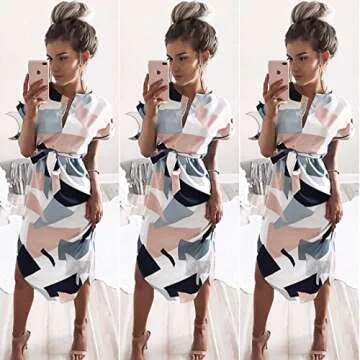 ECOWISH Womens Dresses Summer Casual V-Neck Floral Print Geometric Pattern Belted Summer Dresses for Women 2023 White Small