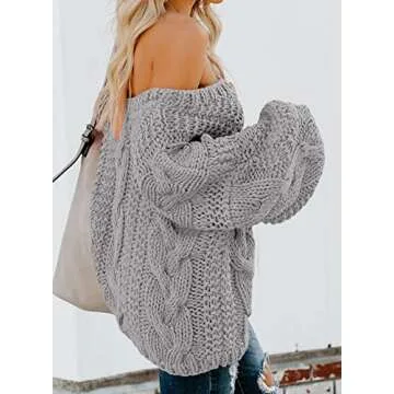 Ecrocoo Women's Off The Shoulder Long Sleeve V-Neck Ribbed Cable Knit Sweaters Pullover 2023 Fashion Fall Winter Oversized Chunky Loose Fitting Tops,Gray L