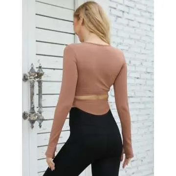 ECUPPER Womens Long Sleeve Workout Crop Tops Built in Bra Seamless Athletic Shirts Compression Yoga Gym Top with Thumb Holes Camel