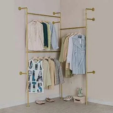 Show moreIntroducing the **EDCB Modern Simple Industrial Pipe Double Hanging Rods Clothing Rack** – the perfect blend of functionality and aesthetic appeal! Designed for modern living, this wall-mounted heavy-duty clothing rack combines a sturdy metal frame with a sleek gold finish, making it an eye-catching addition to any space. Measuring an impressive 93.7 inches in height, 84 inches in length, and 11.4 inches in width, it provides abundant storage without consuming valuable floor space. Whether it’s for your retail shop display or your personal wardrobe, this rack offers an elegant solution for hanging garments, accessories, and more.