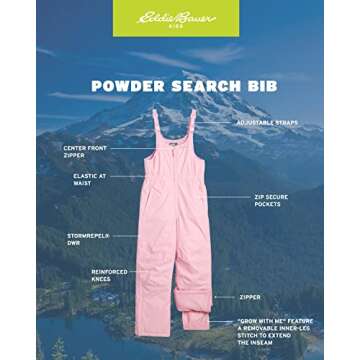 Show more Equip your child for endless winter adventures with the Eddie Bauer Kids Snow Bib. This officially licensed product champions over a century of experience in creating high-quality outdoor apparel, perfectly designed to inspire kids to explore the great outdoors, even in the coldest months. Crafted for both boys and girls, these insulated snow pants are not only stylish but also functional, making them a staple for every child ranging from ages 3 to 16. The comfortable and cozy design, showcased in a vibrant soft pink, ensures your child stands out while enjoying their favorite winter sports.